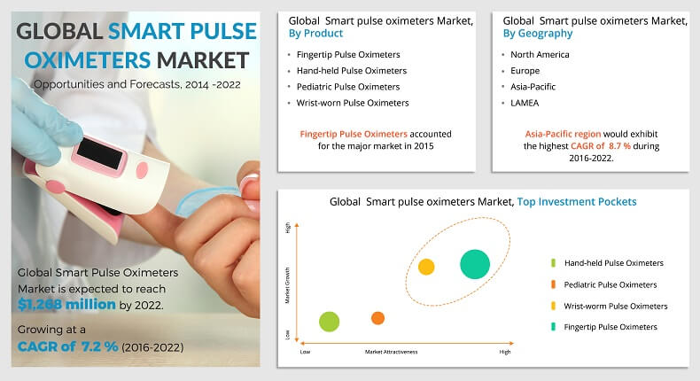 According to a new report published by Allied Market Research titled, Smart Pulse Oximeter Market by Product Type, and Geography: Global Opportunity Analysis and Industry Forecast, 2018-2026, the global smart pulse oximeter market is poised to reach $1,268 million by 2026, registering a CAGR of 7.2% from 2018 to 2026. Fingertip pulse oximeters segment is expected to dominate the global smart pulse oximeters market in 2019.